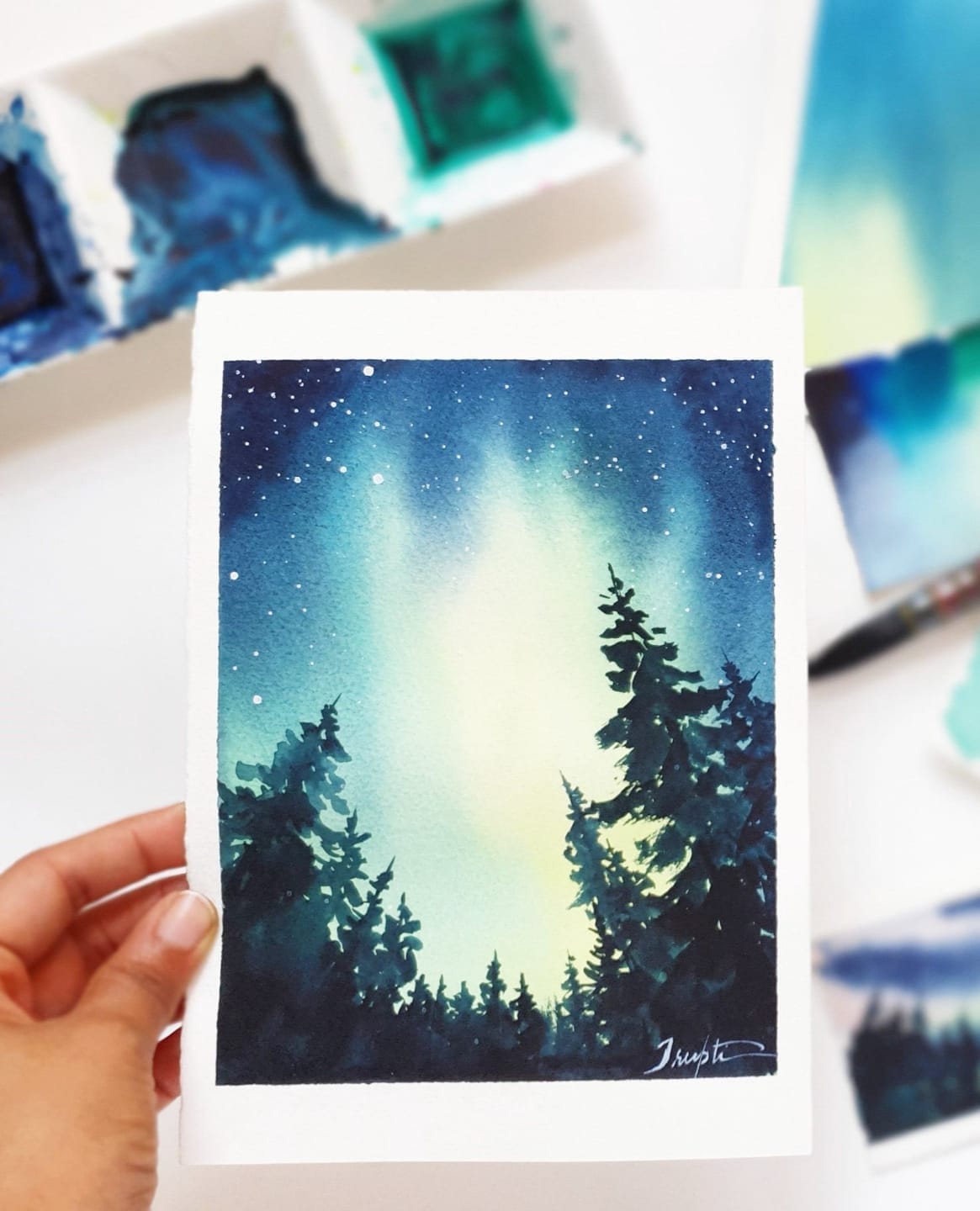 Paint a stunning night sky with glowing Northern Lights and stars with easy steps.