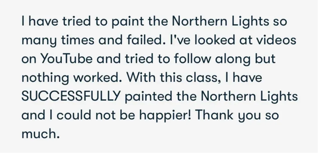 ✨ In this 6 tutorial bundle, I’m teaching you my step-by-step techniques for painting awe-inspiring landscapes like Misty Pines, Northern Lights and Lake Reflections.