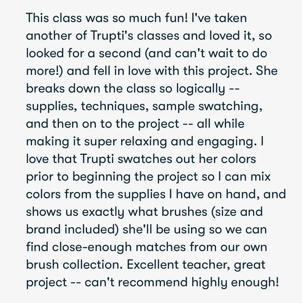 At the end of every class, you'll be making the class project painting and submitting in a private form + in our artists community. This is the accountability you've been looking for to gently challenge yourself, actually paint and gain momentum!