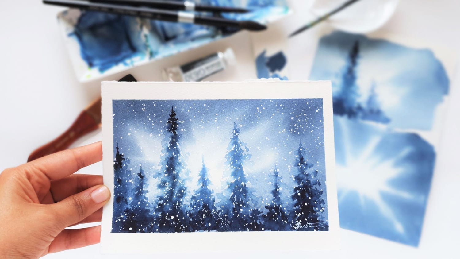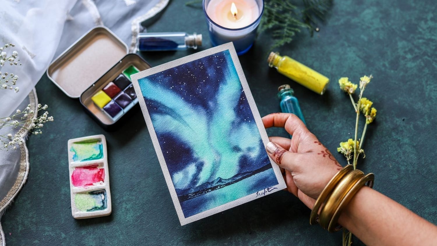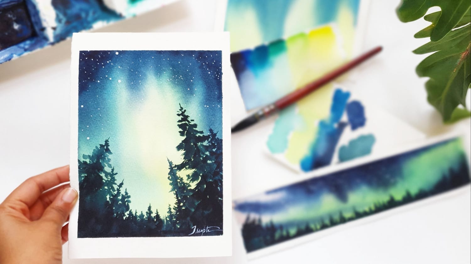 Paint luminous Northern Lights while embracing the spontaneity of watercolors, letting the paint guide you to effects only this medium can achieve.
