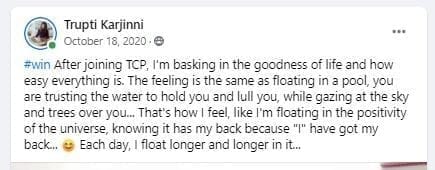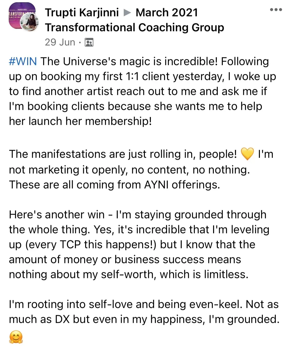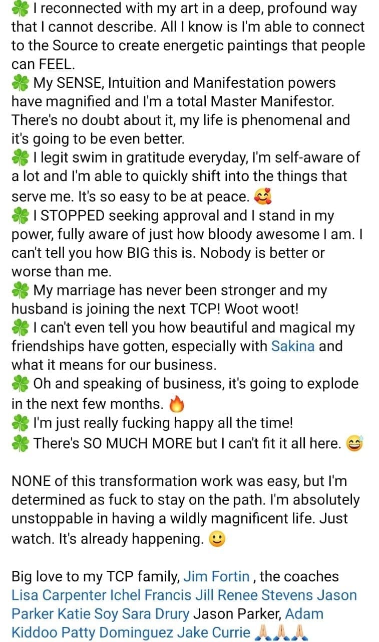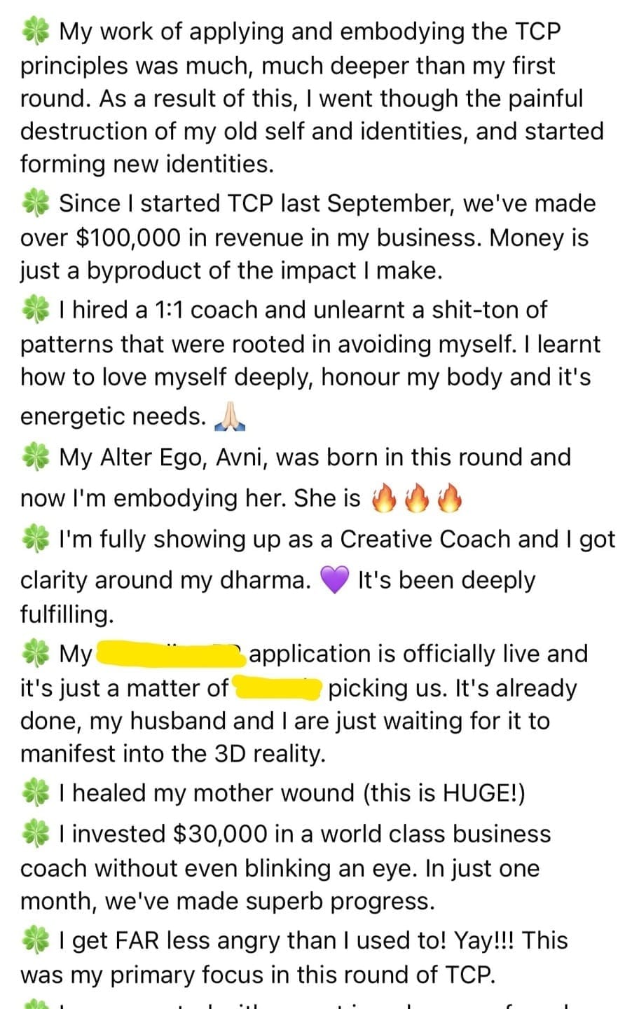 But money almost came as a by-product. Through TCP, I finally found self-love, self-worth, and my dharma to serve people as a Creative Coach.