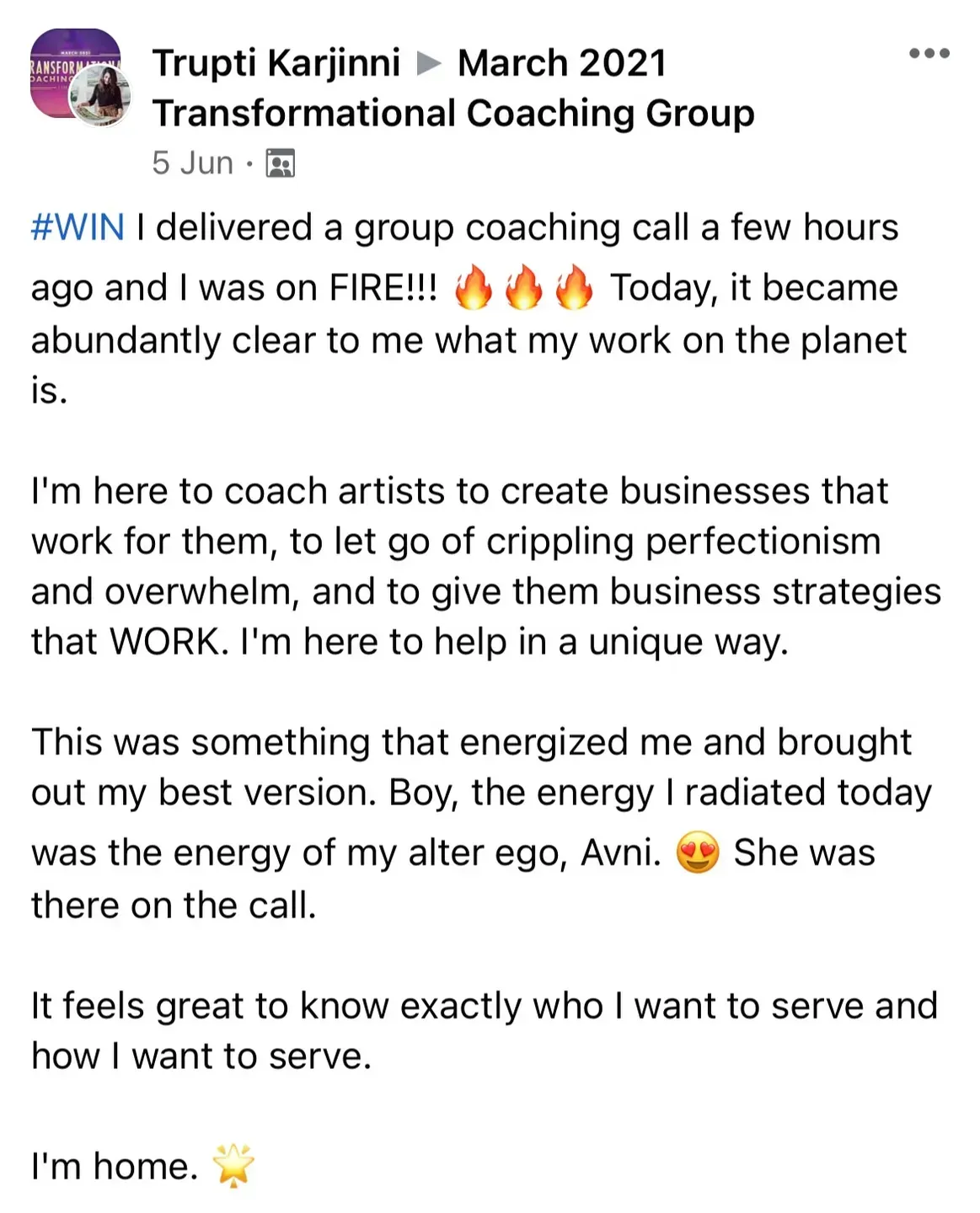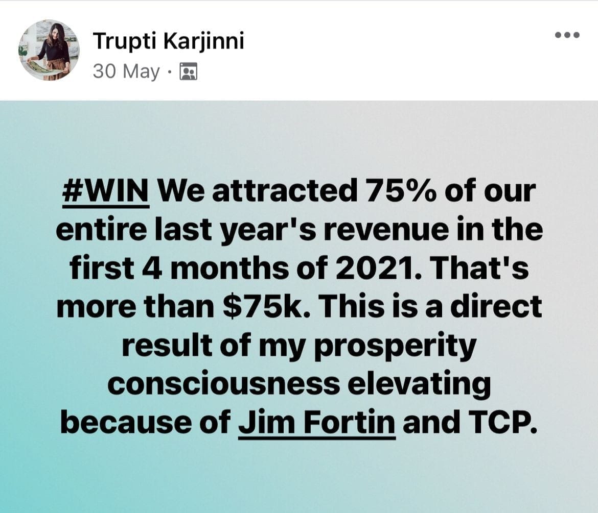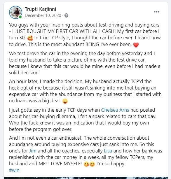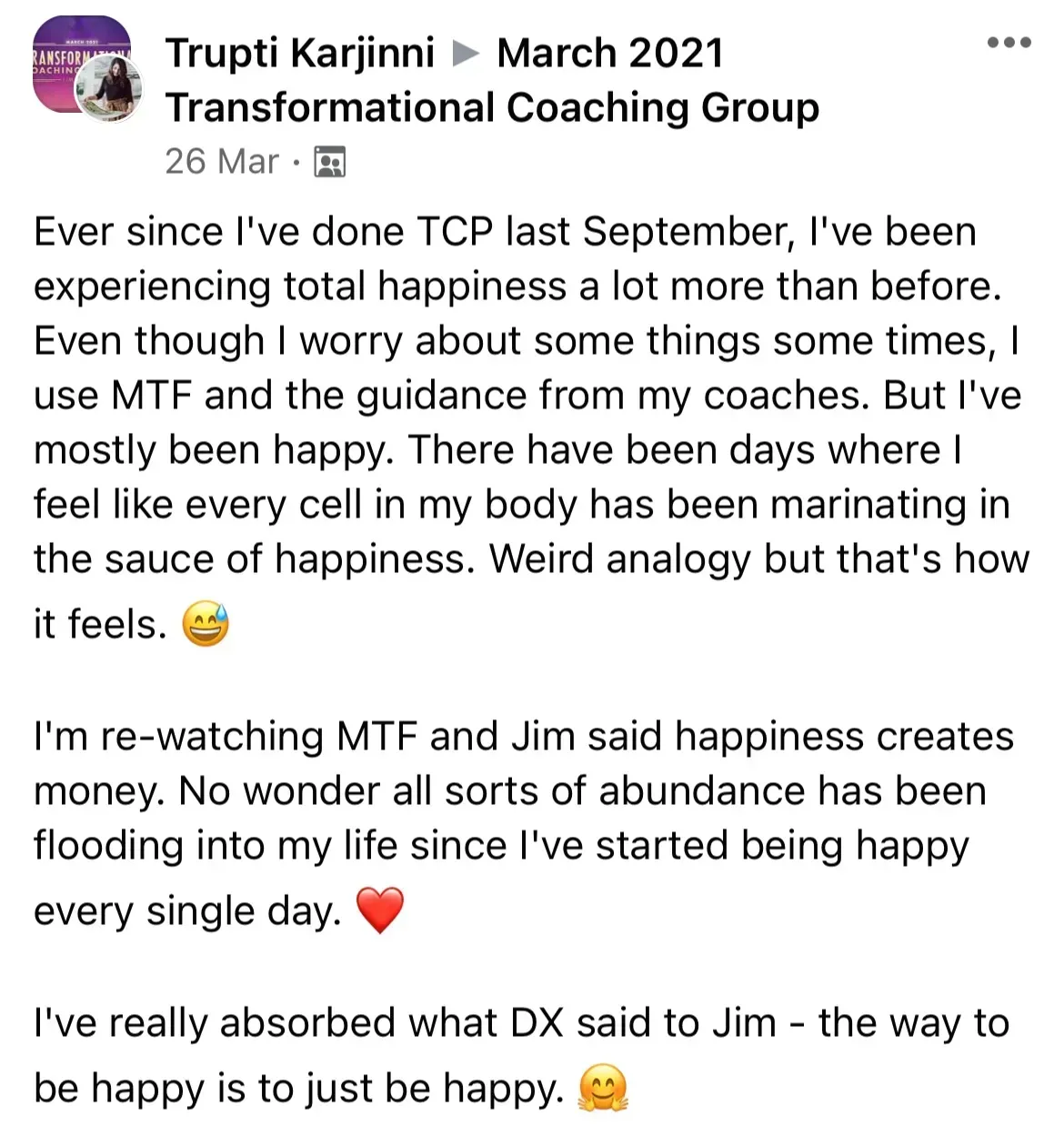 But money almost came as a by-product. Through TCP, I finally found self-love, self-worth, and my dharma to serve people as a Creative Coach.